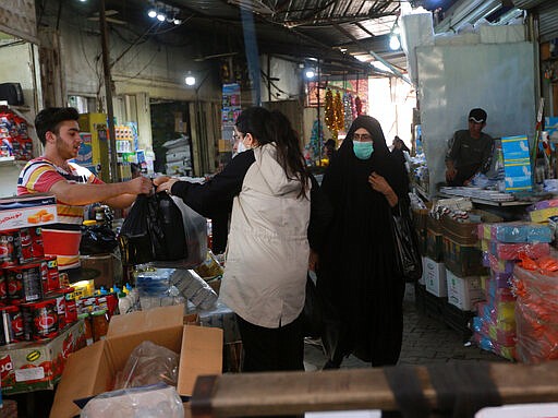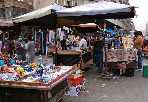 In this Monday, March 16, 2020 photo, people shop in the main Shurja market in central Baghdad, Iraq. The economic fallout from the new coronavirus coupled with a sudden drop in oil prices threatens to catapult Iraq into an unprecedented crisis. The crude-exporting country is struggling to finance measures to contain the COVID-19 pandemic amid a leadership void in the federal government. (AP Photo/Khalid Mohammed)