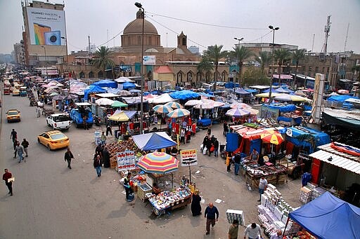 In this Tuesday, March 10, 2020 photo, people shop in the main Shurja market in central Baghdad, Iraq. The economic fallout from the new coronavirus coupled with a sudden drop in oil prices threatens to catapult Iraq into an unprecedented crisis. The crude-exporting country is struggling to finance measures to contain the COVID-19 pandemic amid a leadership void in the federal government. (AP Photo/Hadi Mizban)