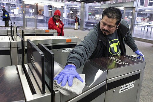 FILE - In this March 14, 2020 file photo, a cleaning crew wipes down table surfaces at the Transportation Security Administration's checkpoint at Terminal 5 at New York's John F. Kennedy International Airport. As the global viral pandemic grows, the need for cleaning and disinfecting has surged. Cleaners and domestic workers are essential in the effort to contain the virus. (AP Photo/Kathy Willens, File)