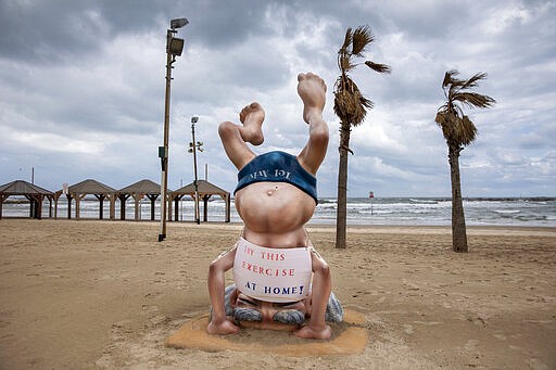 A sign calling people to stay home to reduce the spread of the new coronavirus is placed on a statue of the first Israeli Prime Minister David Ben Gurion at a beach in Tel Aviv, Israel, Friday, March 20, 2020. Prime Minister Benjamin Netanyahu said he was further tightening restrictions on movement, with exceptions only to go out for food or other urgent matters. For most people, the new coronavirus causes only mild or moderate symptoms. For some it can cause more severe illness. (AP Photo/Oded Balilty)