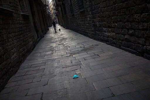 A face mask on the ground as a woman walks with her dog along a street in downtown Barcelona, Spain, Friday, March 20, 2020. For most people, the new coronavirus causes only mild or moderate symptoms. For some, it can cause more severe illness, especially in older adults and people with existing health problems. (AP Photo/Emilio Morenatti)