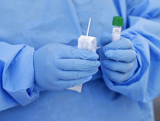 A healthcare worker prepares to collect a sample to test for COVID-19 at a drive-through testing site Friday, March 20, 2020, at the Doris Ison Health Center in Miami. (AP Photo/Wilfredo Lee)