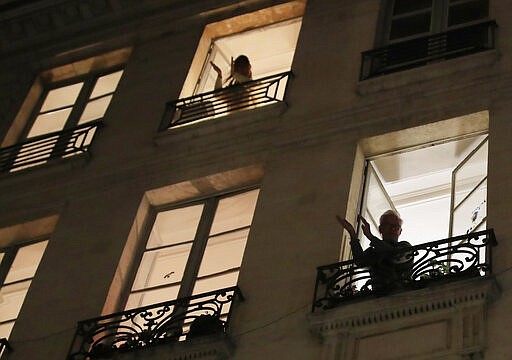 People applaud the caregivers for their work, as the coronavirus ravaged communities across the country, in Paris, Friday, March 20, 2020. Paris police imposed a ban for the weekend on the Seine River banks. For most people, the new coronavirus causes only mild or moderate symptoms, such as fever and cough. For some, especially older adults and people with existing health problems, it can cause more severe illness, including pneumonia. (AP Photo/Michel Euler)