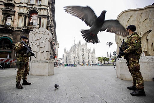 Italian soldiers patrol as the Duomo gothic cathedral is visible in background, in Milan, Friday, March 20, 2020. Mayors of many towns in Italy are asking for ever more stringent measures on citizens' movements to help contain the surging infections of the coronavirus. For most people, the new coronavirus causes only mild or moderate symptoms. For some it can cause more severe illness. (AP Photo/Luca Bruno)