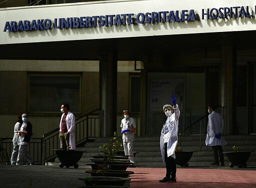 Health services staff members protest outside the Txagorritxu hospital demanding more protection equipment, after a Spanish nurse died Thursday from coronavirus COVID-19 in a hospital, in Vitoria, northern Spain, Friday March 20, 2020. Spain will mobilise 200 billion euros for workers and vulnerable citizens, Prime Minister Pedro Sanchez announced Tuesday. For many people the coronavirus causes mild or moderate symptoms, but for some it causes more severe illness, especially in older adults and people with existing health problems. (AP Photo/Alvaro Barrientos)