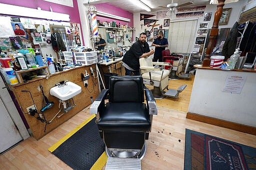 Carlos Vasquez, left, and his nephew R.J. Vasquez, wait for customers at their family's barber shop Friday, March 20, 2020, in Houston. The barbers at family-owned barber shop estimate they have lost nearly half of their business due to the coronavirus. (AP Photo/David J. Phillip)