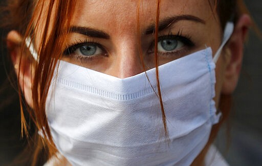 An member of the group 'Pause the System' wears a face mask as she protests in front of the entrance to Downing Street in London, Friday, March 20, 2020. For most people, the new coronavirus causes only mild or moderate symptoms, such as fever and cough. For some, especially older adults and people with existing health problems, it can cause more severe illness, including pneumonia. (AP Photo/Frank Augstein)