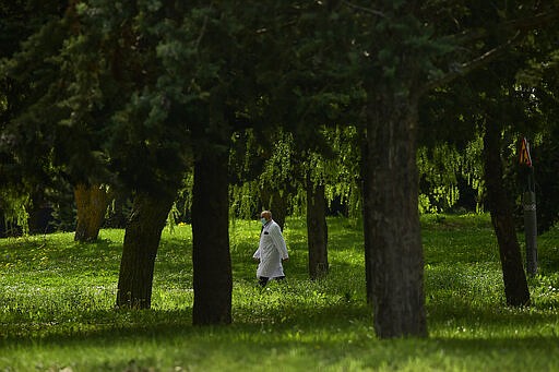 A member of the health service at Txagorritxu hospital walks along the perimeter of the hospital, in Vitoria, northern Spain, Vitoria, northern Spain, March 20, 2020. Spain will mobilize 200 billion euros or the equivalent to one fifth of the country's annual output in loans, credit guarantees and subsidies for workers and vulnerable citizens, Prime Minister Pedro Sanchez announced Tuesday. For most people, the new coronavirus causes only mild or moderate symptoms. For some, it can cause more severe illness, especially in older adults and people with existing health problems. (AP Photo/Alvaro Barrientos)