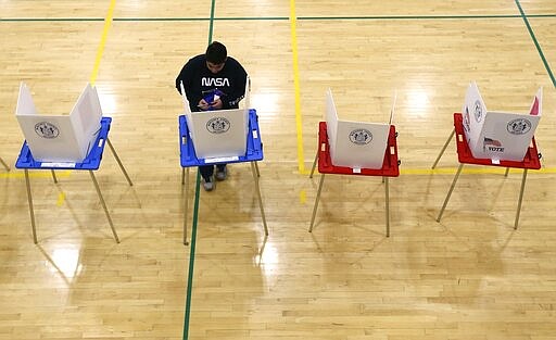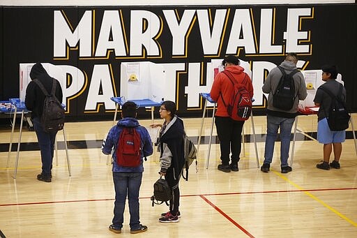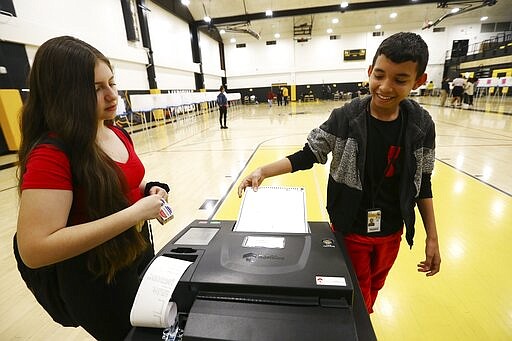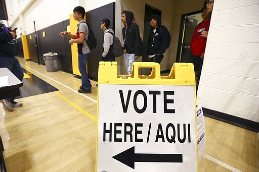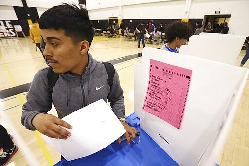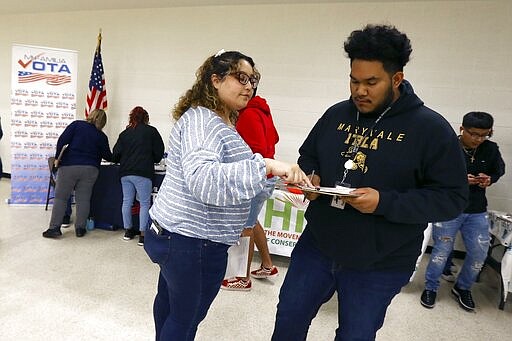 In this March 5, 2020, photo students participate in their own Democratic presidential preference election and voter registration drive at Maryvale High School in Phoenix. At the school hundreds of students who will turn 18 before Election Day were registered to vote. (AP Photo/Ross D. Franklin)