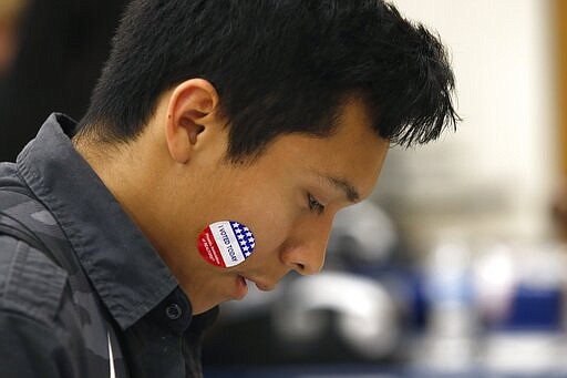 In this March 5, 2020, photo Angel Tapia displays his "I Voted Today" sticker as students participate in their own Democratic presidential preference election and voter registration drive at Maryvale High School in Phoenix. At the school hundreds of students who will turn 18 before Election Day were registered to vote. (AP Photo/Ross D. Franklin)