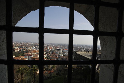 In this photo taken on Tuesday, March 17, 2020, a view of Bergamo, the heart of the hardest-hit province in Italy’s hardest-hit region of Lombardy, Italy. For most people, the new coronavirus causes only mild or moderate symptoms. For some it can cause more severe illness, especially in older adults and people with existing health problems. (AP Photo/Luca Bruno)