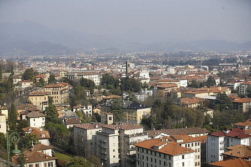 In this photo taken on Tuesday, March 17, 2020, a view of Bergamo, the heart of the hardest-hit province in Italy’s hardest-hit region of Lombardy, Italy, Tuesday, March 17, 2020. For most people, the new coronavirus causes only mild or moderate symptoms. For some it can cause more severe illness, especially in older adults and people with existing health problems. (AP Photo/Luca Bruno)