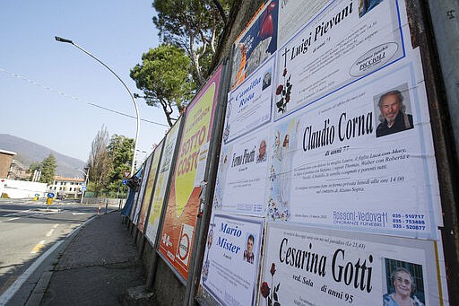 FILE - In this Tuesday, March 17, 2020 filer, death notices are seen on a board along an empty road in Alzano Lombardo, near Bergamo, the heart of the hardest-hit province in Italy’s hardest-hit region of Lombardy, Italy, Tuesday, March 17, 2020. For most people, the new coronavirus causes only mild or moderate symptoms. For some it can cause more severe illness, especially in older adults and people with existing health problems. (AP Photo/Luca Bruno, File)