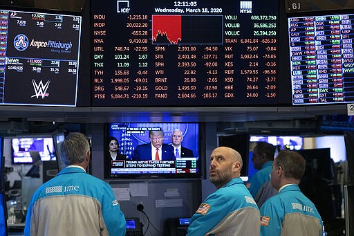 FILE - In this March 18, 2020, file photo traders at the New York Stock Exchange watch President Donald Trump's televised White House news conference in New York. When President Donald Trump speaks, financial markets gyrate and quiver in real time. (AP Photo/Mark Lennihan, File)
