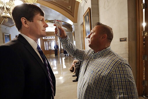 FILE - In this Monday, March 16, 2020 file photo, Sen. Brian Kelsey, R-Germantown, left, has his temperature taken by Scott Wyatt, of the Tennessee Department of Health, before Kelsey entered a room for a news conference concerning the state's response to the COVID-19 coronavirus in Nashville, Tenn. (AP Photo/Mark Humphrey)