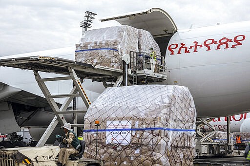 An Ethiopian Airlines cargo flight from Guangzhou, China arrived with 5.4 million face masks, 1.08 million testing kits, 40,000 sets of protective clothing and 60,000 protective face shields, according to Ethiopian officials and the Jack Ma Foundation.