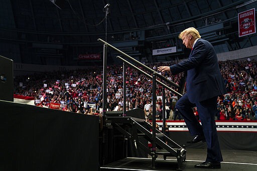 FILE - In this March 2, 2020, file photo President Donald Trump arrives to speak at a campaign rally at Bojangles Coliseum in Charlotte, N.C. For the next seven months, Trump may be consigned to campaigning in a country beset by a fear of job loss, bankruptcy and disease. It will require a remarkable pivot for the president, who has relentlessly cheered the stock market's rise and the economy's strength as the central predicate for a second term. (AP Photo/Evan Vucci, File)