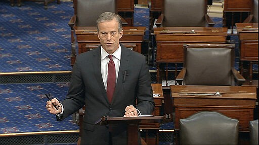 In this image from video, Sen. John Thune, R-S.D., speaks on the Senate floor at the U.S. Capitol in Washington, Sunday, March 22, 2020. (Senate Television via AP)