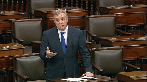 In this image from video, Sen. Dick Durbin, D-Ill., speaks on the Senate floor at the U.S. Capitol in Washington, Sunday, March 22, 2020. (Senate Television via AP)