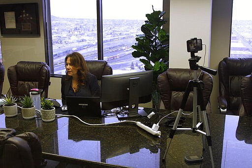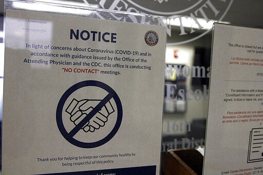 A notice on the door of Rep. Veronica Escobar, D-Texas, explains that it is closed to in-person visits on Wednesday, March 18, 2020, in El Paso, Texas. Inside, Escobar answered questions from constituents during in a virtual town hall about the coronavirus. (AP Photo/Cedar Attanasio)