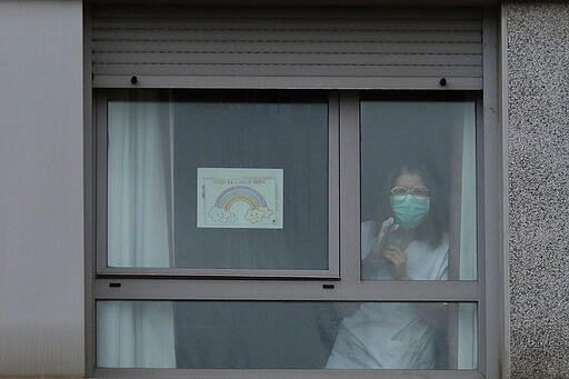 A nurse looks out from a window inside of a nursing homes where dead bodies were found at the nursing homes of Usera in Madrid, Spain, Tuesday, March 24, 2020. Spanish army troops disinfecting nursing homes have found, to their horror, some residents living in squalor among the infectious bodies of people that authorities suspect have died from the new coronavirus. Prosecutors have launched a judicial probe. For some, it can cause more severe illness, especially in older adults and people with existing health problems. (AP Photo/Manu Fernandez)