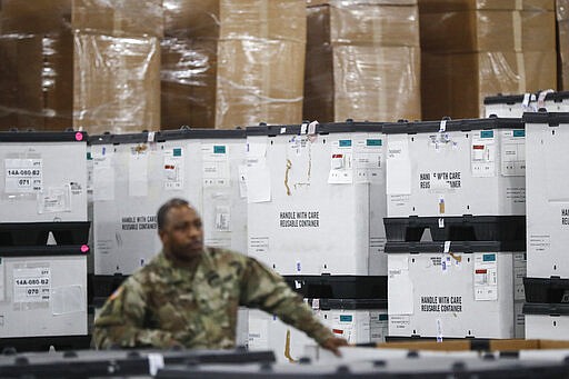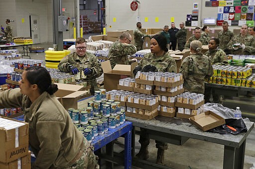 FILE - In this March 24, 2020, file photo, members of The Ohio National Guard assist in repackaging emergency food boxes for food distribution at the Cleveland Food Bank in Cleveland. The use of National Guard units around the country to help with the response to the coronavirus pandemic is prompting rumors of a national lockdown or even martial law. Guard units are now helping to transport medical supplies, distribute food and even help direct traffic at drive-through testing sites. (AP Photo/Tony Dejak, File)