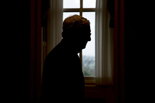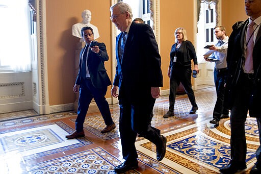 Senate Majority Leader Mitch McConnell of Ky. walks to the Senate Chamber on Capitol Hill in Washington, Monday, March 23, 2020, as the Senate is working to pass a coronavirus relief bill. (AP Photo/Andrew Harnik)