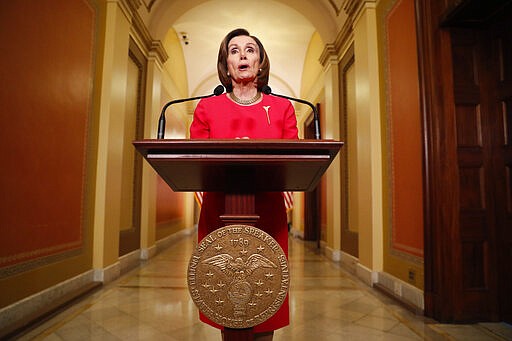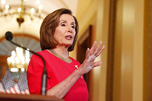 House Speaker Nancy Pelosi of Calif. speaks outside her office on Capitol Hill, Monday, March 23, 2020. (AP Photo/Andrew Harnik, Pool)