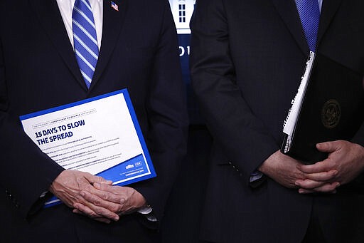 Vice President Mike Pence, left, and Attorney General William Barr hold binders as President Donald Trump speaks about the coronavirus in the James Brady Briefing Room, Monday, March 23, 2020, in Washington. (AP Photo/Alex Brandon)