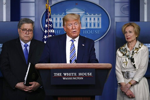 President Donald Trump speaks about the coronavirus in the James Brady Briefing Room, Monday, March 23, 2020, in Washington, as Attorney General William Barr and Dr. Deborah Birx, White House coronavirus response coordinator, listen. (AP Photo/Alex Brandon)