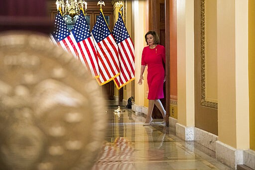 House Speaker Nancy Pelosi of Calif. arrives to read a statement outside her office on Capitol Hill, Monday, March 23, 2020, in Washington. (AP Photo/Andrew Harnik, Pool)