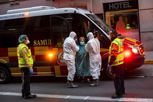 A patient, center, is transferred to a medicalised hotel during the COVID-19 outbreak in Madrid, Spain, Tuesday, March 24, 2020. For most people, the new coronavirus causes only mild or moderate symptoms. For some it can cause a more serious illness. (AP Photo/Bernat Armangue)