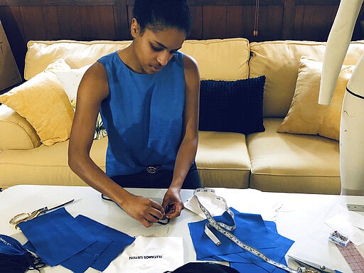 In this Sunday, March 22, 2020, photo, provided by Christina Hunter, Briana Danyele sews cloth face masks that say "We Got This!" in her mother's living room in Greer, S.C., which will be sent to health care workers. Legions of everyday Americans are sewing masks for desperate hospitals, nursing homes and homeless shelters amid the expanding coronavirus pandemic. (Christina Hunter via AP)