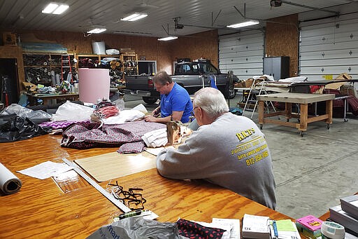 In this Sunday, March 22, 2020 photo, Bill Purdue, left, cuts pieces of fabric while Mike Rice sews them into face masks in Rice's autobody and upholstery shop in Washington, Ind. They will deliver the masks this week to Deaconess Health System in Evansville, Indiana, which asked community members to sew cloth masks for health care workers who may face a shortage amid the coronavirus pandemic. They're among legions of everyday Americans making face masks for desperate hospitals, nursing homes and homeless shelters that could run out of personal protective equipment.(photo courtesy of Robin Rice via AP)