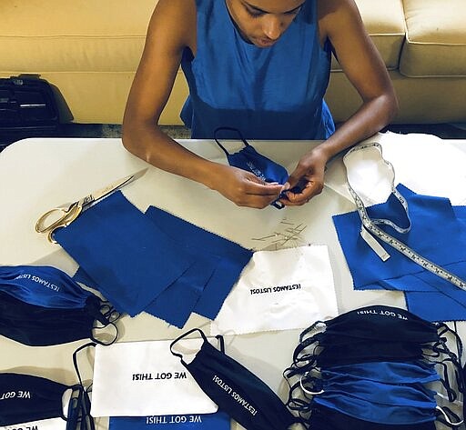 Fashion designer Briana Danyele left Italy last month to return to her mother's Greer, South Carolina, home, where she has turned the living room into a mini sewing factory, making masks that she embroiders with the words, "We Got This!"