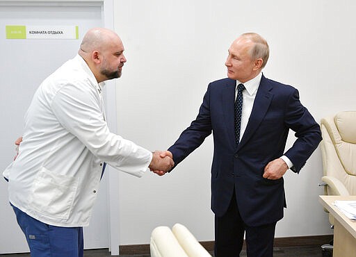 Russian President Vladimir Putin, right shakes hands with the hospital's chief Denis Protsenko during his visit to the hospital for coronavirus patients in Kommunarka settlement, outside Moscow, Russia, Tuesday, March 24, 2020. During a visit to the Komunarka hospital on Moscow outskirts, Putin praised its doctors for high professionalism, saying they were working "like clockwork." (Alexei Druzhinin, Sputnik, Kremlin Pool Photo via AP)