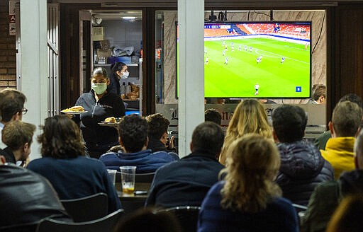 FILE - In this Tuesday March 10, 2020 filer, waiters wearing masks serve food and drink in a terrace outside Mestalla stadium during the Champions League round of 16 second leg soccer match between Valencia and Atalanta in Valencia, Spain. It was the biggest soccer game in Atalanta’s history and a third of Bergamo’s population made the short trip to Milan’s famed San Siro Stadium to witness it. Nearly 2,500 fans of visiting Spanish club Valencia also traveled to the Champions League match. More than a month later, experts are pointing to the Feb. 19 game as one of the biggest reasons why Bergamo has become one of the epicenters of the coronavirus pandemic — a “biological bomb” was the way one respiratory specialist put it — and why 35% of Valencia’s team became infected. The new coronavirus causes mild or moderate symptoms for most people, but for some, especially older adults and people with existing health problems, it can cause more severe illness or death. (AP Photo/Alberto Saiz, File)