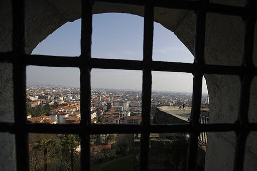 In this photo taken on Tuesday, March 17, 2020, a view of Bergamo, the heart of the hardest-hit province in Italy's hardest-hit region of Lombardy, Italy. It was the biggest soccer game in Atalanta’s history and a third of Bergamo’s population made the short trip to Milan’s famed San Siro Stadium to witness it. Nearly 2,500 fans of visiting Spanish club Valencia also traveled to the Champions League match. More than a month later, experts are pointing to the Feb. 19 game as one of the biggest reasons why Bergamo has become one of the epicenters of the coronavirus pandemic — a “biological bomb” was the way one respiratory specialist put it — and why 35% of Valencia’s team became infected. The new coronavirus causes mild or moderate symptoms for most people, but for some, especially older adults and people with existing health problems, it can cause more severe illness or death. (AP Photo/Luca Bruno)