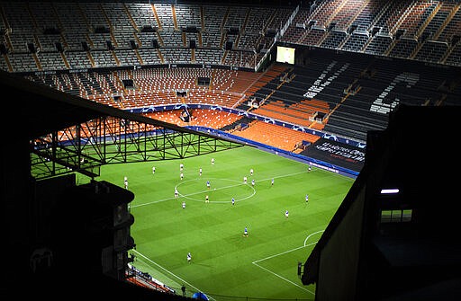 FILE - In this Tuesday March 10, 2020 file photo a general view of the Mestalla stadium during the Champions League round of 16 second leg soccer match between Valencia and Atalanta in Valencia, Spain. It was the biggest soccer game in Atalanta’s history and a third of Bergamo’s population made the short trip to Milan’s famed San Siro Stadium to witness it. Nearly 2,500 fans of visiting Spanish club Valencia also traveled to the Champions League match. More than a month later, experts are pointing to the Feb. 19 game as one of the biggest reasons why Bergamo has become one of the epicenters of the coronavirus pandemic — a “biological bomb” was the way one respiratory specialist put it — and why 35% of Valencia’s team became infected. The new coronavirus causes mild or moderate symptoms for most people, but for some, especially older adults and people with existing health problems, it can cause more severe illness or death. (AP Photo/Emilio Morenatti, File)