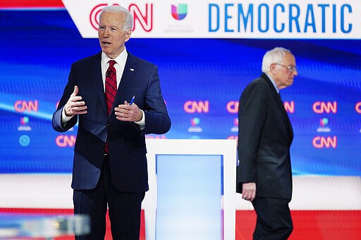 FILE - In this Jan. 27, 2020, file photo, Democratic presidential candidate, former Vice President Joe Biden and senior adviser Symone Sanders participate in a campaign event in Iowa City, Iowa. Biden's status as Democratic presidential nominee-in-waiting means the party will choose another man for an office never held by a woman. But he's running with plenty of women behind him, including a yet-to-be-named vice presidential running mate. (AP Photo/Matt Rourke, File)