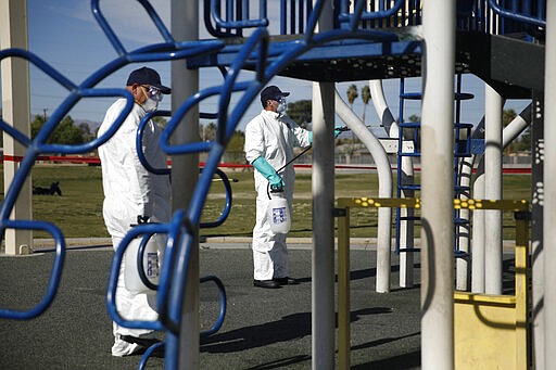 Workers sprayed Las Vegas playground equipment with disinfectant.