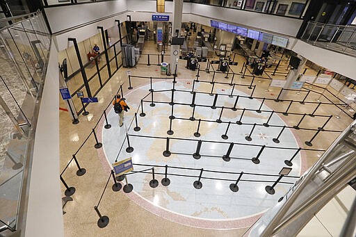 Empty parking spaces surround the Kansas Statehouse In Topeka, Kan., Wednesday, March 25, 2020. The Statehouse is closed to visitors. Shawnee County issued a stay-at-home order beginning tomorrow. (AP Photo/Orlin Wagner)