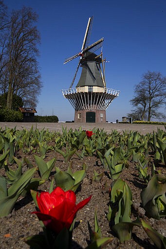 View of the empty, world-renowned, Dutch flower garden Keukenhof which was closed because of the coronavirus, in Lisse, Netherlands, Thursday, March 26, 2020. Keukenhof, which attracted 1.5 million visitors last year, will not open after the Dutch government extended its ban on gatherings to June 1 in an attempt to slow the spread of the virus. Instead of opening, it will allow people to virtually visit its colorful floral displays through its social media and online channels. The new coronavirus causes mild or moderate symptoms for most people, but for some, especially older adults and people with existing health problems, it can cause more severe illness or death. (AP Photo/Peter Dejong)