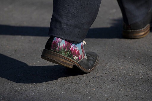 The shoes of Bart Siemerink, director of the world-renowned Dutch flower garden Keukenhof, are adorned with a design of tulips, as he walks the empty lanes of the garden in Lisse, Netherlands, Thursday, March 26, 2020. Keukenhof, which attracted 1.5 million visitors last year, will not open this year after the Dutch government extended its ban on gatherings to June 1 in an attempt to slow the spread of the coronavirus. Instead of opening, it will allow people to virtually visit its colorful floral displays through its social media and online channels. The new coronavirus causes mild or moderate symptoms for most people, but for some, especially older adults and people with existing health problems, it can cause more severe illness or death. (AP Photo/Peter Dejong)