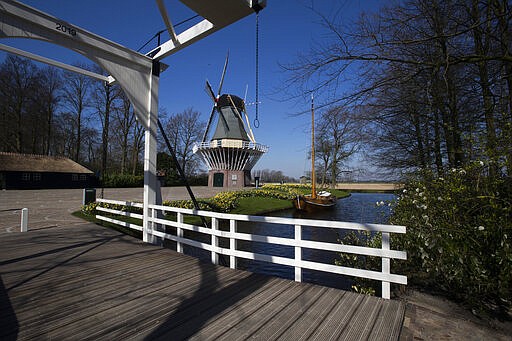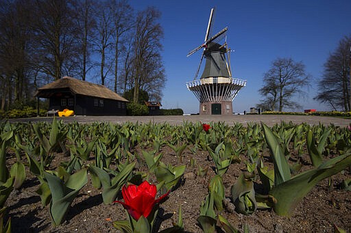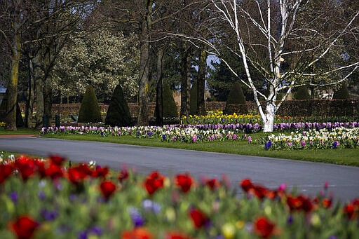 View of the empty, world-renowned, Dutch flower garden Keukenhof which was closed because of the coronavirus, in Lisse, Netherlands, Thursday, March 26, 2020. Keukenhof, which attracted 1.5 million visitors last year, will not open after the Dutch government extended its ban on gatherings to June 1 in an attempt to slow the spread of the virus. Instead of opening, it will allow people to virtually visit its colorful floral displays through its social media and online channels. The new coronavirus causes mild or moderate symptoms for most people, but for some, especially older adults and people with existing health problems, it can cause more severe illness or death. (AP Photo/Peter Dejong)