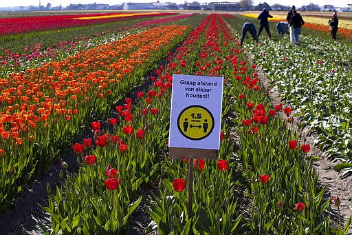 A sign asking people to observe social distancing and keep 1.5 meters, or five feet, apart to reduce the spread of the corona virus was put up in a field of tulips in Lisse, Netherlands, Thursday, March 26, 2020. The world-renowned Dutch flower garden Keukenhof in Lisse will not open this year after the Dutch government extended its ban on gatherings to June 1 in an attempt to slow the spread of the coronavirus. Instead of opening, it will allow people to virtually visit its colorful floral displays through its social media and online channels. The new coronavirus causes mild or moderate symptoms for most people, but for some, especially older adults and people with existing health problems, it can cause more severe illness or death. (AP Photo/Peter Dejong)