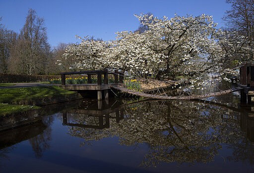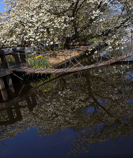 Cherry trees blossom at the empty, world-renowned, Dutch flower garden Keukenhof which was closed because of the coronavirus, in Lisse, Netherlands, Thursday, March 26, 2020. Keukenhof will not open this year after the Dutch government extended its ban on gatherings to June 1 in an attempt to slow the spread of the virus. Instead of opening, it will allow people to virtually visit its colorful floral displays through its social media and online channels. The new coronavirus causes mild or moderate symptoms for most people, but for some, especially older adults and people with existing health problems, it can cause more severe illness or death. (AP Photo/Peter Dejong)