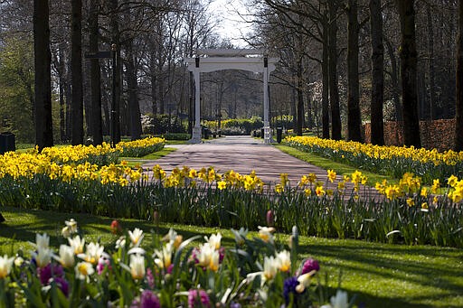 Lanes void of visitors are seen at the world-renowned, Dutch flower garden Keukenhof which was closed because of the coronavirus, in Lisse, Netherlands, Thursday, March 26, 2020. Keukenhof, which attracted 1.5 million visitors will not open this year after the Dutch government extended its ban on gatherings to June 1 in an attempt to slow the spread of the virus. Instead of opening, it will allow people to virtually visit its colorful floral displays through its social media and online channels. The new coronavirus causes mild or moderate symptoms for most people, but for some, especially older adults and people with existing health problems, it can cause more severe illness or death. (AP Photo/Peter Dejong)