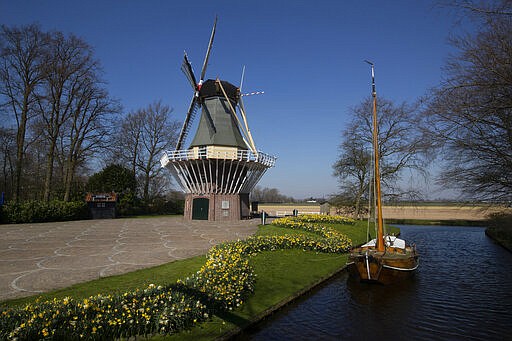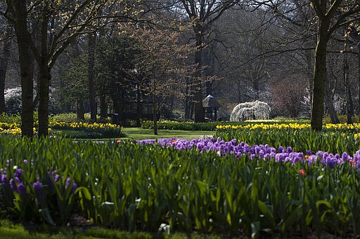 View of the empty world-renowned, Dutch flower garden Keukenhof which was closed because of the coronavirus, in Lisse, Netherlands, Thursday, March 26, 2020. Keukenhof, which attracted 1.5 million visitors last year, will not open after the Dutch government extended its ban on gatherings to June 1 in an attempt to slow the spread of the virus. Instead of opening, it will allow people to virtually visit its colorful floral displays through its social media and online channels. The new coronavirus causes mild or moderate symptoms for most people, but for some, especially older adults and people with existing health problems, it can cause more severe illness or death. (AP Photo/Peter Dejong)