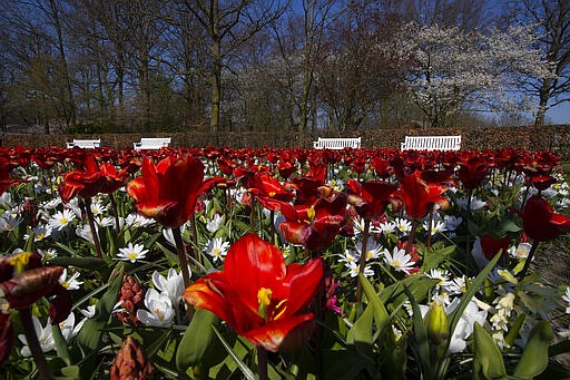 Lanes and benches void of visitors are seen at the world-renowned, Dutch flower garden Keukenhof which was closed because of the coronavirus, in Lisse, Netherlands, Thursday, March 26, 2020. Keukenhof will not open this year after the Dutch government extended its ban on gatherings to June 1 in an attempt to slow the spread of the virus. Instead of opening, it will allow people to virtually visit its colorful floral displays through its social media and online channels. The new coronavirus causes mild or moderate symptoms for most people, but for some, especially older adults and people with existing health problems, it can cause more severe illness or death. (AP Photo/Peter Dejong)